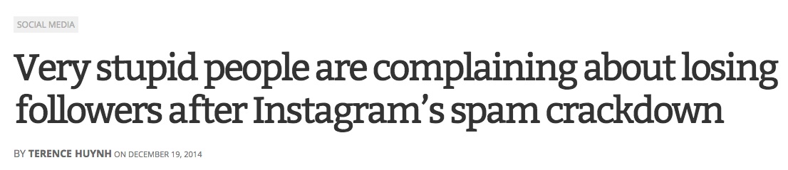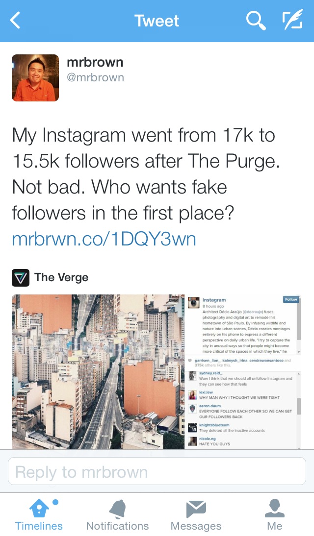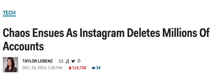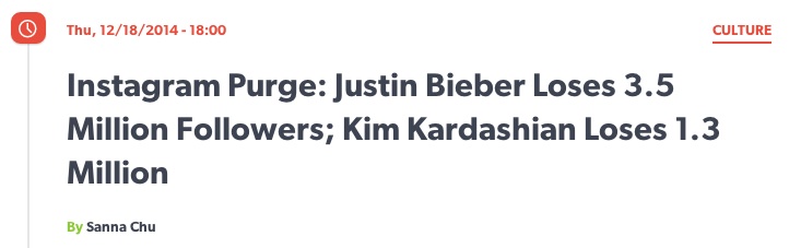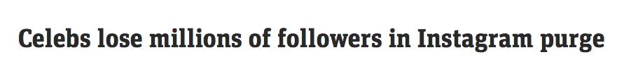 The media furore has thus far been largely focused on the top Instagram accounts (also, please see this brilliant interactive graphic by Zach Allia), namely, mainstream/Hollywood celebrities. Many have taken huge hits (into the millions) to their Follower counts, with a few being shamed into deleting their Instagram accounts all together after facing public ridicule and accusations of having bought “fake followers”.