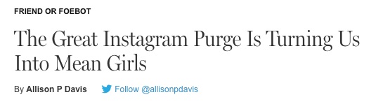 This week’s Internet crisis has been brought to you by The Great Instagram Purge, also known as the Instagram Rapture, the Instagram Clean-up, and the Instagram Sweep (more neologisms to come, I bet). News and entertainment outlets spent the last 24 hours competing for the most chaos-inducing headline.
