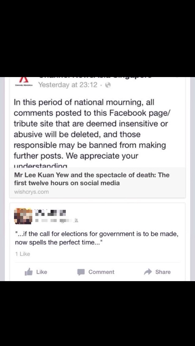 On 23 March 2015, I published this post cataloging very early social media reactions to the passing of a prominent political figure in Singapore. In my usual fashion, I posted the link to the post on my personal and work Facebook accounts (both private but with the post marked visible to all), and my public Twitter account, where hashtags were omitted.