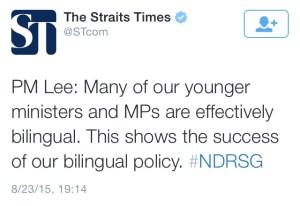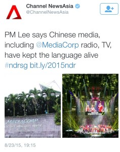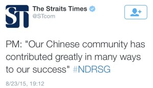 I followed the official #ndrsg hashtag on Twitter (after a brief breakdown in transmission where the hashtag was pulling up zero results!) during the Malay & Chinese language address between 1845hrs and 1930hrs, tracking Tweet coverage from the two major English language mainstream news networks, The Straits Times (@STcom) and Channel News Asia (@ChannelNewsAsia).