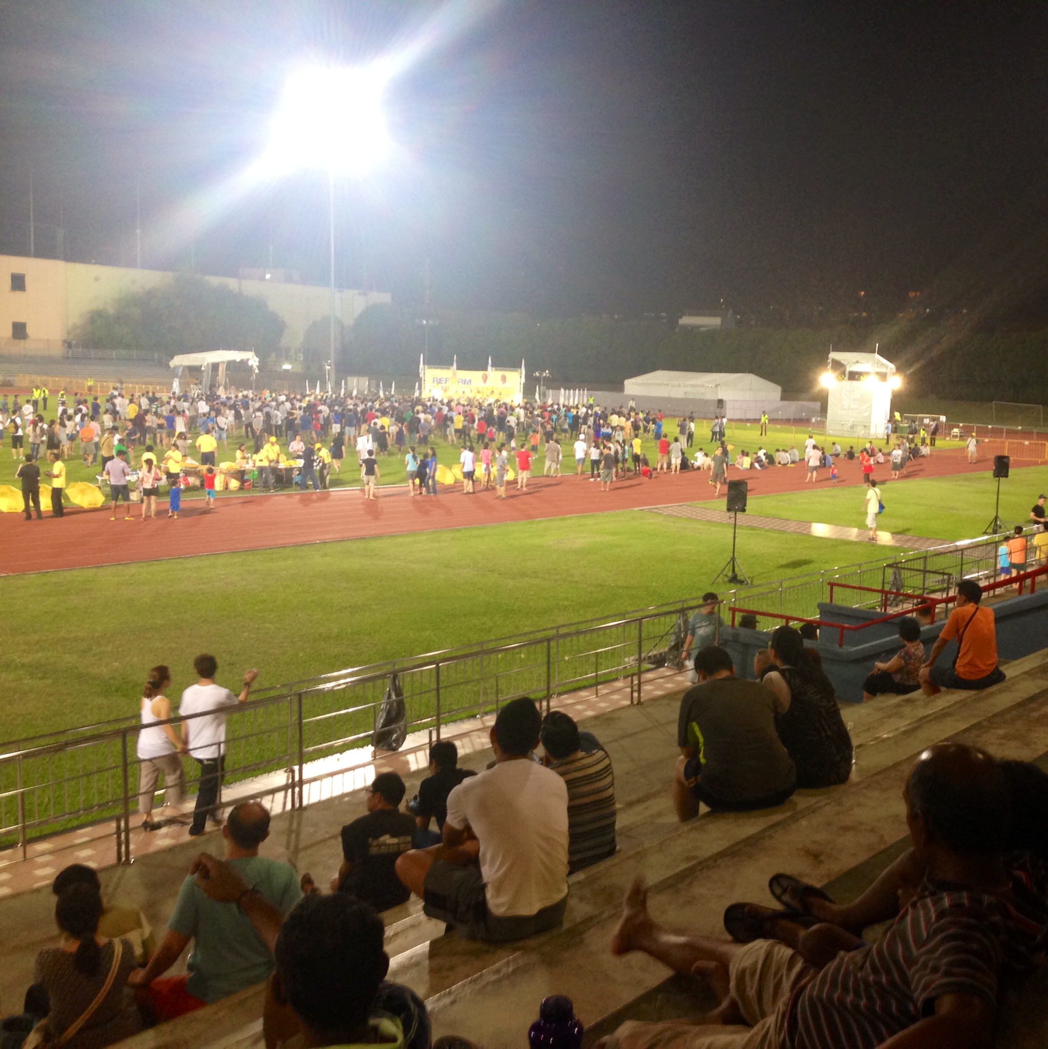 Several picnic mats and baskets and stools amidst clusters of enthusiastic peoples, party flags and torches in tow.