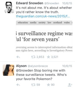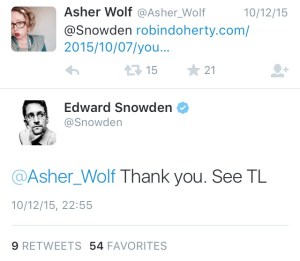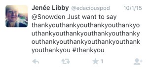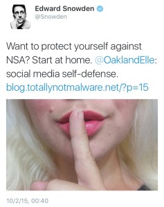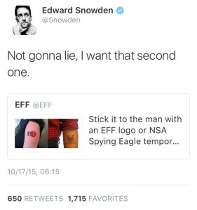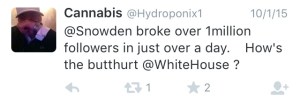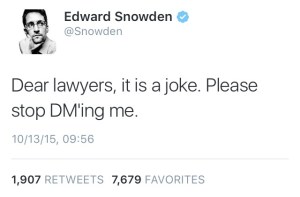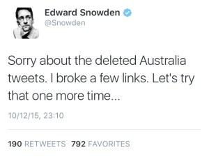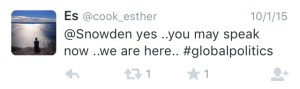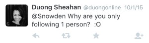 On this Twitter monthsary (sorry), I handcode Snowden’s 198 Tweets to date, and feature selected displays of his Internet savvy. Screengrabs taken on October 30th, 2015, 1200hrs GMT+8.