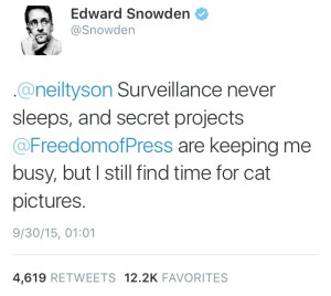 If anything, Snowden’s first Twitter conversation with renown American astrophysicist Neil deGrasse Tyson or @neiltyson (aka the Internet’s. Favourite. Badass. Meme.), prepared us for the Snowden wit that was to come.
