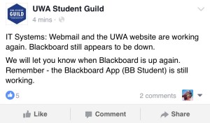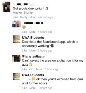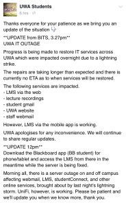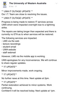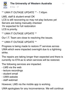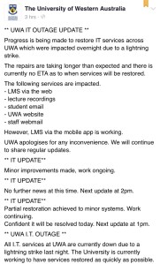 It has been a whirlwind Sunday for staff and students at the University of Western Australia (UWA). A lightning storm on Saturday night caused a power outage to IT services across the campus, causing all webpages with a ‘.uwa.edu.au’ domain – especially webmail, Blackboard, and the Learning Capture System (LCS) – to go offline. The inconvenience was especially salient to the UWA community as this was the weekend before the mid-semester exam season. The opening screenshot is just a sampling of the student and staff queries and complaints that were streaming in on Facebook and Twitter.