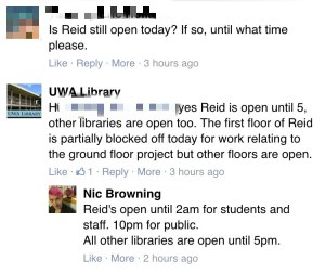As mentioned earlier, tensions were probably extra high given that many students had planned for last minute weekend cramping before their mid-semester exams this week. While I appreciate the attempt at humour from the UWA Library Facebook page (long live Internet cats btw) and the UWA Students Twitter feed (emoticons as tension diffusers), I’m not sure advising panicky students to take a “lazy Sunday morning lie-in” or “relaxing Sunday picnic” helped to sooth any nerves. Knowing internet vernacular is one thing. Being able to discern when a situation is appropriate for it is another skill altogether.