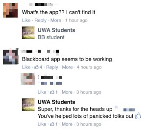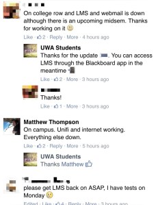 It is not clear how these four different entities, their management, or their corporate communications are related or ordered into a hierarchy. Had all reposts on the various secondary pages come from a single primary source – say the UWA Library Facebook page as the arm that oversees IT services, or The University of Western Australia Facebook page as the primary institutional page, or the UWA Students page as the most engaging and responsive presence on social media all day – the audience would have been better able to discern which the authoritative source of updates was, and follow/track just one Facebook page for updates instead of going on a mini-tour of every single page each time we sought new information.