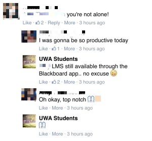 Elsewhere, I thought the UWA Students Facebook page displayed excellent parlance savvy when providing personal responses to individual comments *and* playfully encouraging students to get back on track (also, emoji game strong).