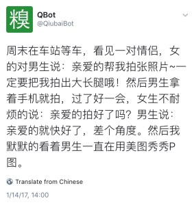 In the second tweet, the user recounts a scene they had witnessed, in which a woman instructs her partner to take a photo of her and to hold the camera in an angle such that her legs will appear longer in the frame. She waits for some time as her partner makes a few unsuccessful attempts, after which he secretly uses the leg elongation feature on MeituXiuxiu to save himself the trouble. This captures the culture of “Instagram husbands” or women who make their male partners take #OOTDs (outfit of the day) photos of them in public places. It is often joked that these are elaborate processes dreaded by male partners because the women dish out several requests for the frame to capture something specific in the background, while highlighting her body in favourable light over several different poses. For instance, a common practice is for male partners to bend down or squat while capturing a photo from waist or knee height such that the woman photographed will appear taller.