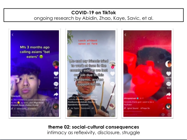 Today, I presented some of my ongoing research on COVID-19 and TikTok at Digital Intimacies 6 (#DigInt20). In the talk, I reviewed the biography of TikTok against the historical and cultural trajectory of short video app cultures in the Asia Pacific region, and considered what ‘TikTok’ and ‘COVID-19’ are placeholders when we talk about how they have impacted society. I then mapped out three broad genres of COVID-19 content on TikTok.