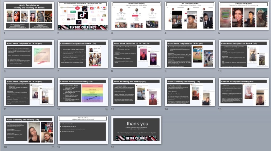 It is the last day of Digital Intimacies 6 (#DigInt20), and today my collaborator and friend D. Bondy Valdovinos Kaye and I presented some initial thoughts form our project on ‘Audio Templates as Identity and Intimacy on TikTok’.