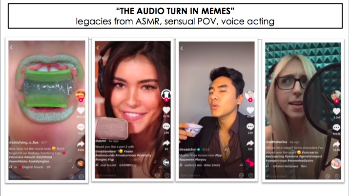 These follow from various legacies of ASMR, sensual POVs, voice acting, and perhaps even phone sex and podcasting. We are now at the stage of our research of sorting through our empirical data and diving into the various scholarship on sound and intimacy, to inform our analysis. Here are some TikToks in various audio-intimate genres: