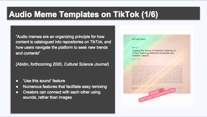 In our talk and paper-in-progress, we consider what we are calling ‘the audio turn in memes’, wherein sounds have become the dominant element in a trajectory of memes. We considered how copyright and branding of memes are being mapped over to the genre and ecology of sounds, and looked at some TikTok creators who have utilised catchphrases, iconic exaggerations of accents and tonalities, and soundtracks to ‘brand’ their content and persona: