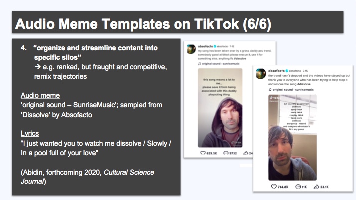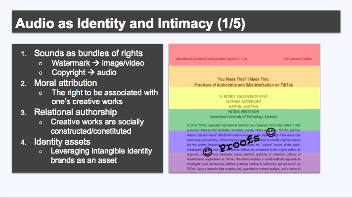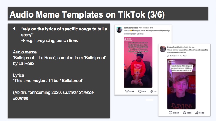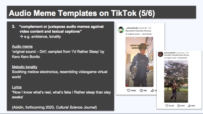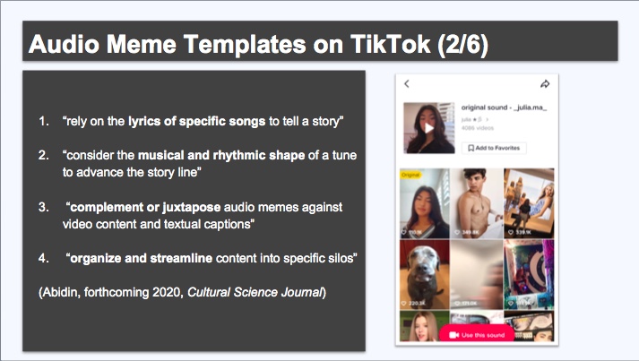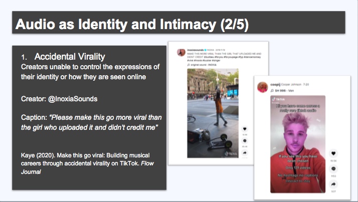 In our preliminary analysis, we identified a few modes through which audio on TikTok is used to convey identity and intimacy, but in our short 12min talk for #DigInt20, we focused on four emergent points.