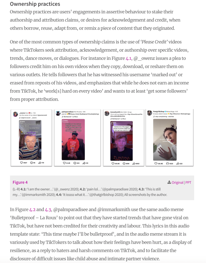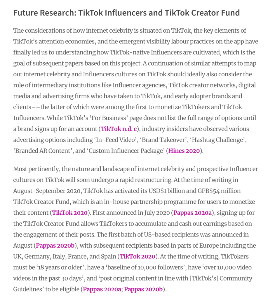 The article closes with a segue to my current and forthcoming research, closely studying the TikTok Creator Fund and its impact on vernacular cultures on TikTok and the Influencer industry at large.