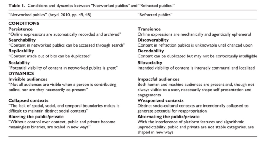 While “networked publics” arose from media and communication studies of social network sites during the decade of the 2000s, focused on platforms, infrastructure, and affordances, “refracted publics” is birthed from anthropological and sociological studies of internet user cultures during the decade of the 2010s, focused on agentic and circumventive adaptations of what platforms offer them.