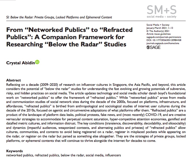 Abidin, Crystal. 2021. “From ‘networked publics’ to ‘refracted publics’: A companion framework for researching ‘below the radar’ studies.” Social Media + Society 7(1): 1-13. DOI: 10.1177/2056305120984458 <Open Access>