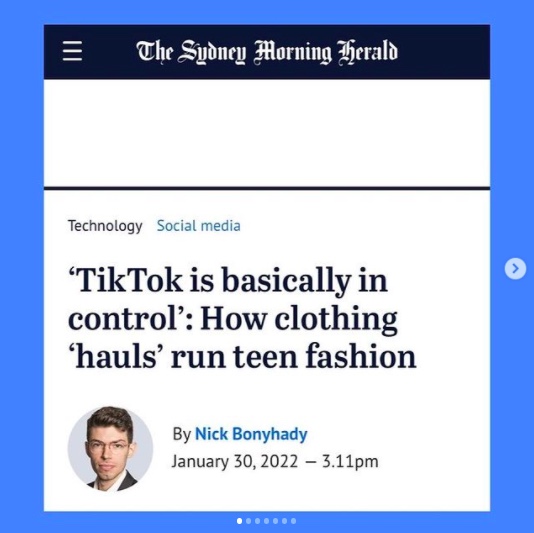Read: “‘TikTok is basically in control’: How clothing ‘hauls’ run teen fashion.” Sydney Morning Herald, 30 January 2022. <Link>