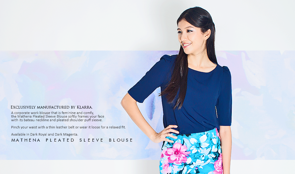 A corporate work blouse that is feminine and comfy, the Mathena Pleated Sleeve Blouse softly frames your face with its bateau neckline and pleated shoulder puff sleeve. Pinch your waist with a thin leather belt or wear it loose for a relaxed fit. Available in Dark Royal and Dark Magenta.