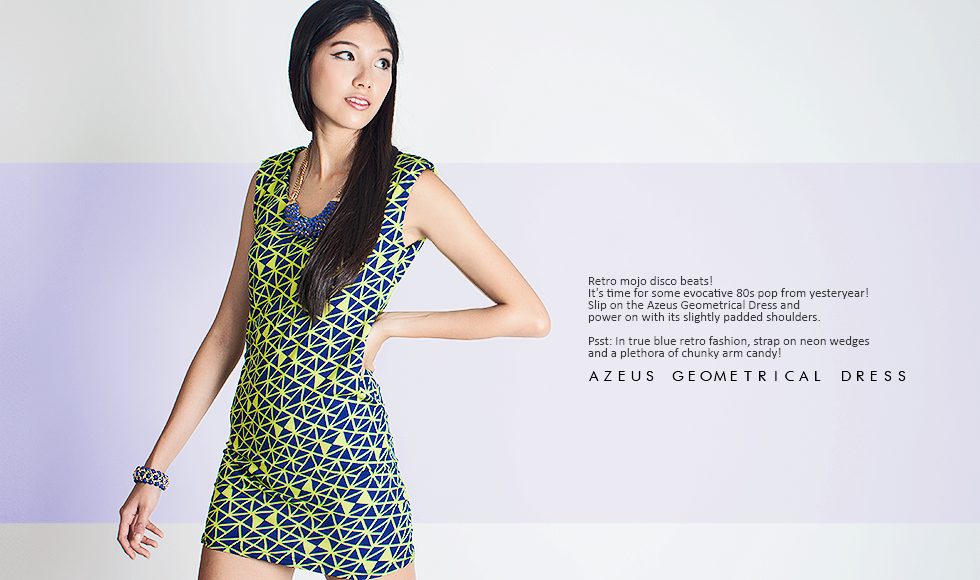 Retro mojo disco beats! It’s time for some evocative 80s pop from yesteryear! Slip on the Azeus Geometrical Dress and power on with its slightly padded shoulders. Psst: In true blue retro fashion, strap on neon wedges and a plethora of chunky arm candy!